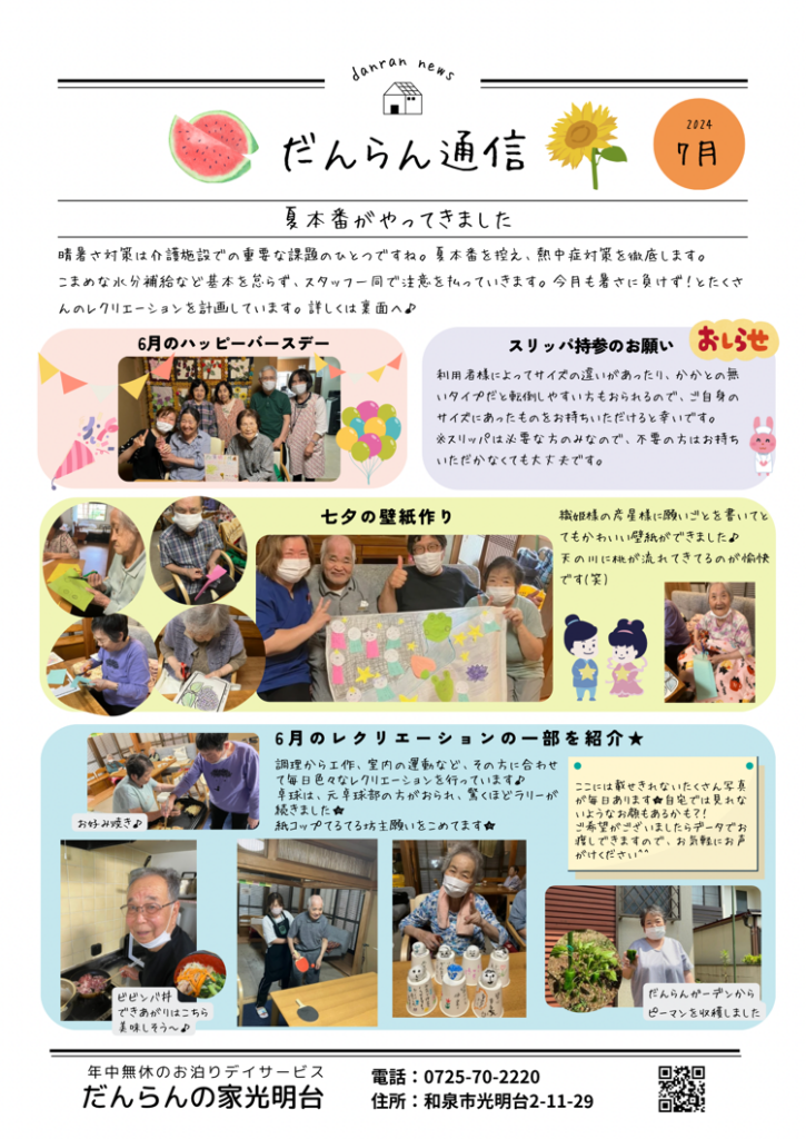 だんらん通信7月号 2024年6月28日2024年6月28日 6月末になりました!半年があっという間に過ぎ、7月に入ろうとしていますが、このぐづついた不安定な気候の中、体調はくずされてないですか?だんらんの家光明台では、七夕に向けての壁紙つくりをしてたりと様々なイベントをこなして元気に過ごしていました。今回のだんらん通信はそんな日々の様子や、スリッパ持参のお願いなどを載せています。 今年の梅雨は短い予想の様で、その分一降りの雨量が多くなるとか!?みなさま大雨には気をつけてくださいね!! by family