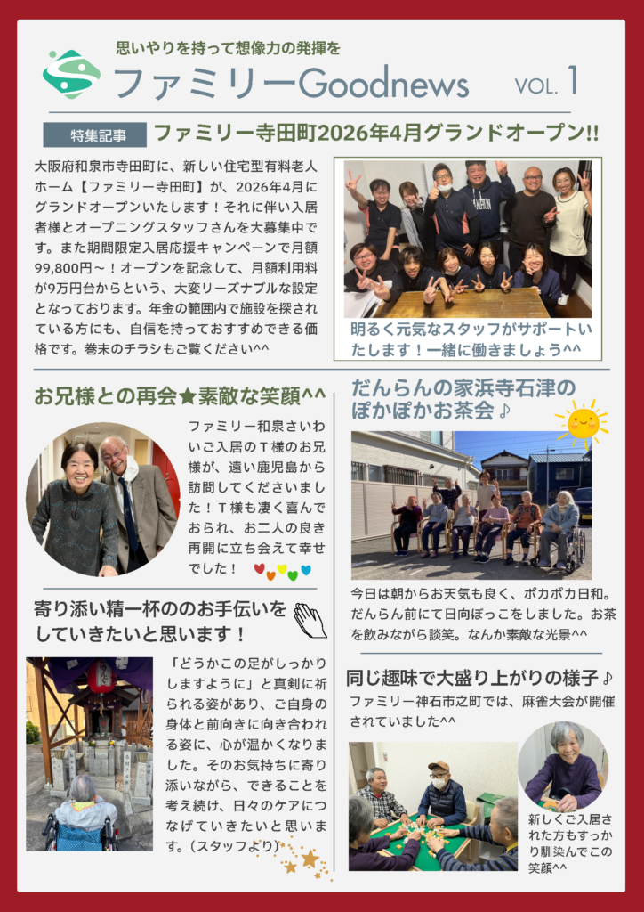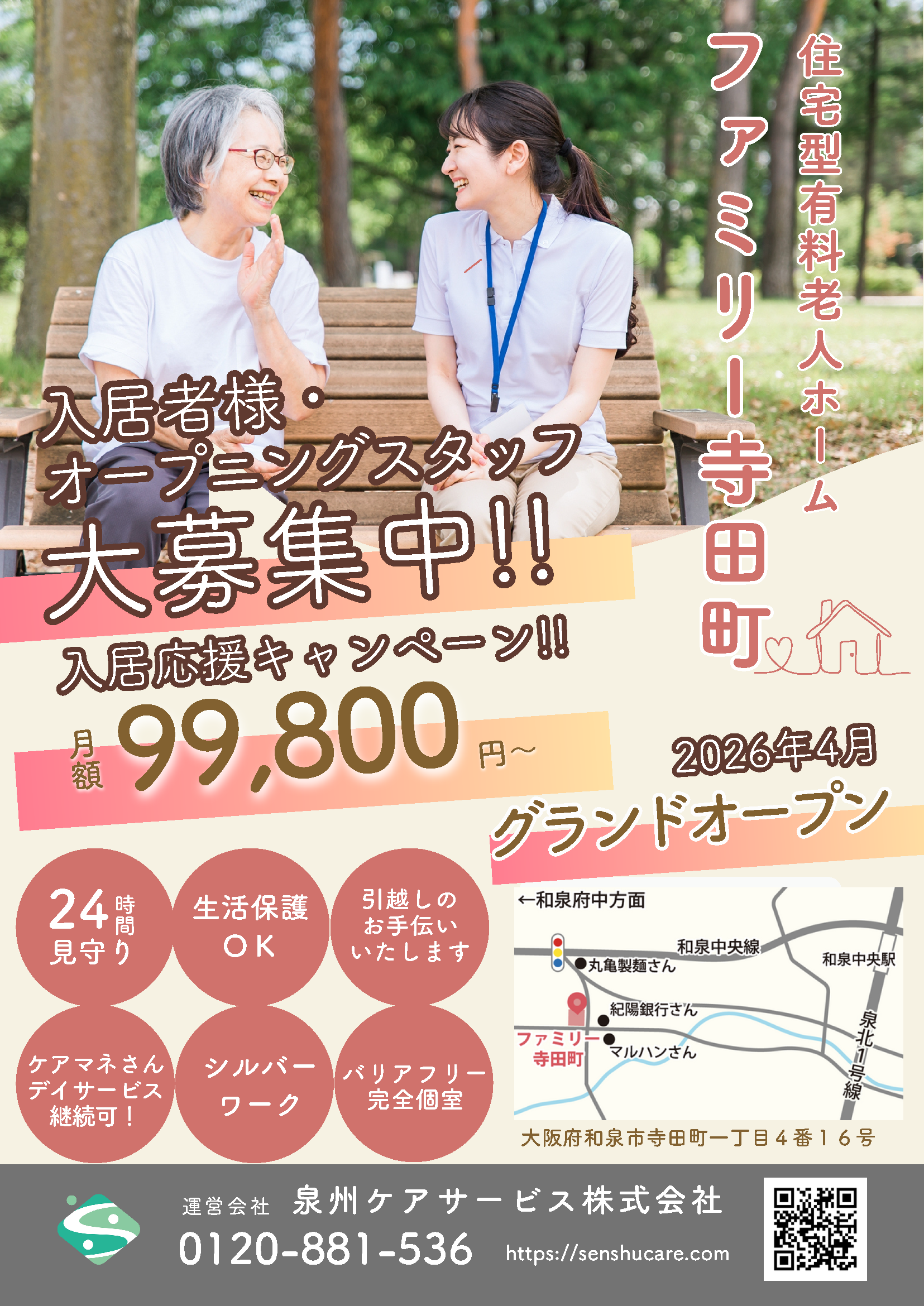 - ・2026年4月「ファミリー寺田町」グランドオープン! 和泉市寺田町に新しい住宅型有料老人ホームが誕生します。現在、入居者様と共に、新しい歴史を創るオープニングスタッフも大募集中です!