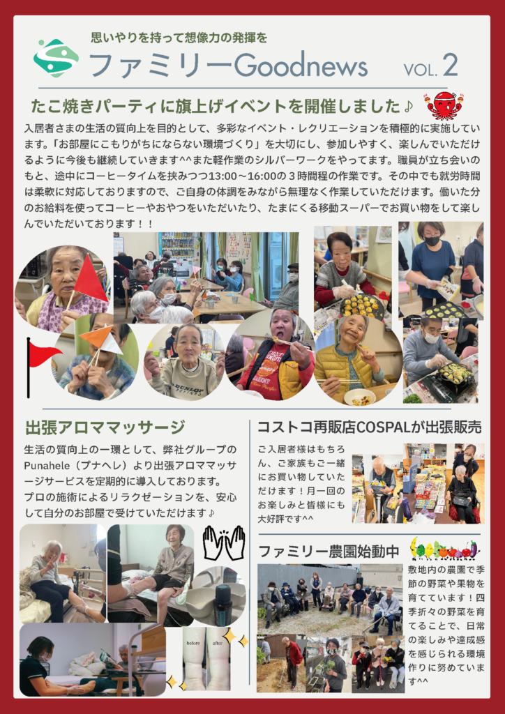 - ・笑顔が溢れるイベントレポート 「だんらんの家浜寺石津」でのお茶会や、「ファミリー神石市之町」での熱い麻雀大会など、日々のワクワクする光景をお届けします 。