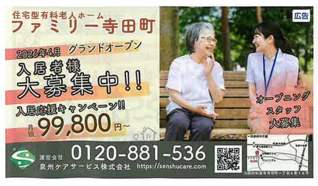 和泉市の皆様におなじみの「広報いずみ 3月号」(2026年3月号)に、当グループの住宅型有料老人ホーム「ファミリー寺田町」の広告が掲載されています!